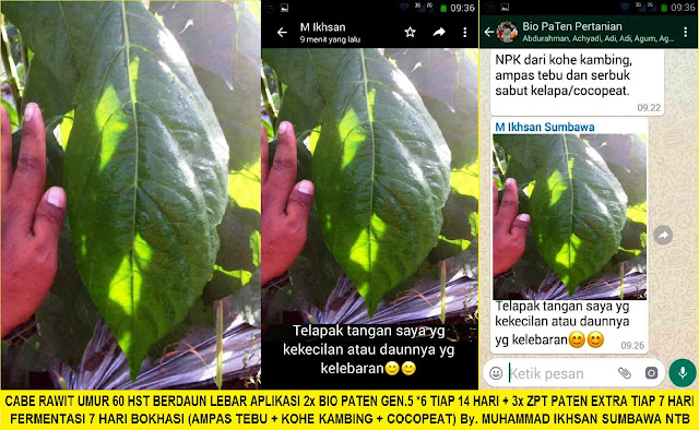 3. Minggu 3 / Tanami setelah tumbuh Aplikasikan hasil Fermentasi 1liter Bio PaTen Gen.5 *6 + gula/molase/ tetes 1kg + 500cc ZPT Multiguna, semprot ke seluruh bagian tanaman dan tanah secara merata tiap 7hari sekali sampe 2minggu sebelum panen.